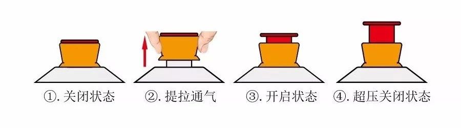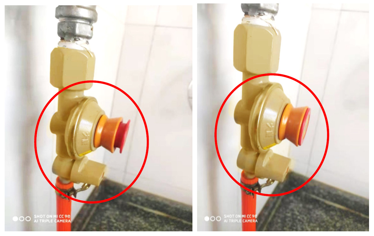 2、如果紅色提帽沒有吸回(下圖右),說明軟管、竈具不漏氣,用戶可以放心使用。